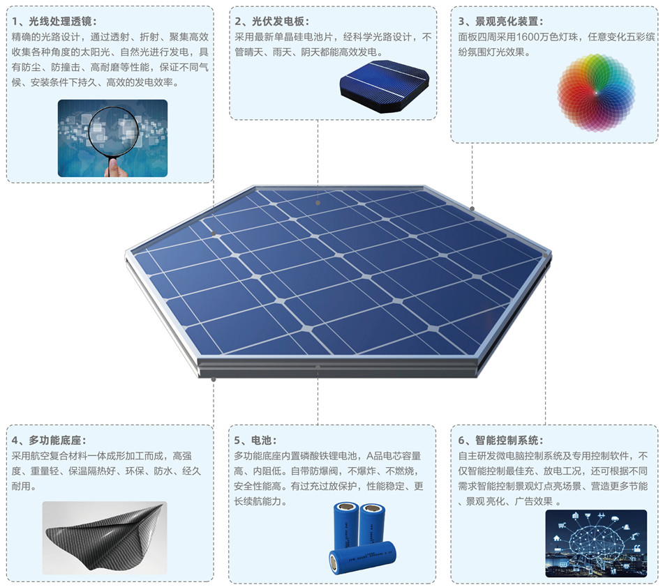 ③白天發(fā)電,自主為整個建筑提供電能,讓每個建筑都可變成綠色能源站;晚上還可以發(fā)出五顏六色的景觀亮化光線,實現建筑物的景觀亮化效果。