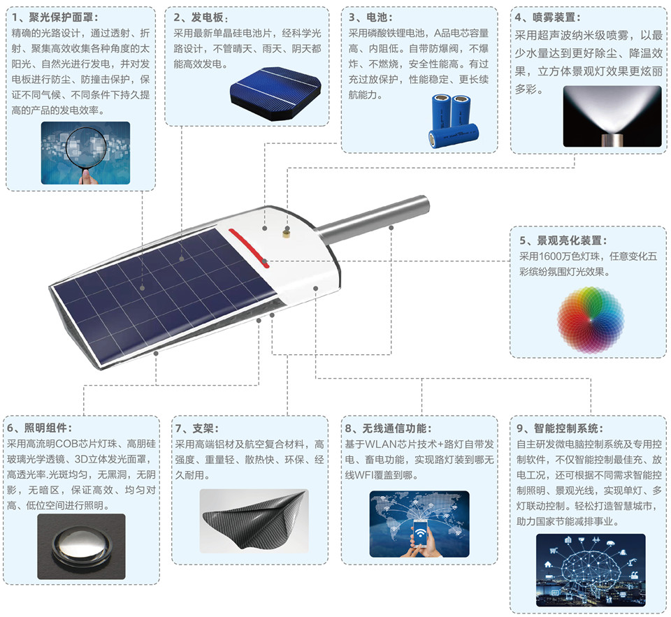 ①通過科學的光路設(shè)計采用特制的聚光保護面罩,對各種角度的太陽光進行折射、聚焦后再高效發(fā)電。陰雨天也能持續(xù)發(fā)電,發(fā)電效率比普通太陽能路燈提高 30%以上;