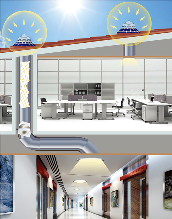 光導(dǎo)管照明結(jié)合發(fā)電式防雨裝置或市電,利用發(fā)電式防雨裝置白天所發(fā)的電或市電帶動特制LED夜間補(bǔ)光裝置為夜間提供照明,電光源和自然光之間通過智能恒光控制器實現(xiàn)全自動智能控制,自然光差多少,電光源就自動補(bǔ)多少,不管外部天氣、照度如何變化,都能全天候滿足室內(nèi)恒定的照明光線需求。