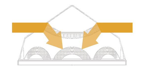 不僅使上午及下午陽光轉(zhuǎn)向?qū)?,還對光線進(jìn)行聚焦,提高采光效率