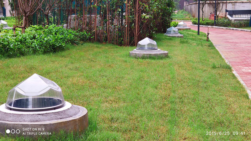 附加自主研發(fā)的自然光采光-光伏-光電智能照明系統(tǒng)可以避免安裝電力照明系統(tǒng),晚上利用光伏發(fā)電裝置白天所發(fā)的電帶動無電照明系統(tǒng)里加裝的LED補光模塊進行照明,實現(xiàn)24小時無電照明。