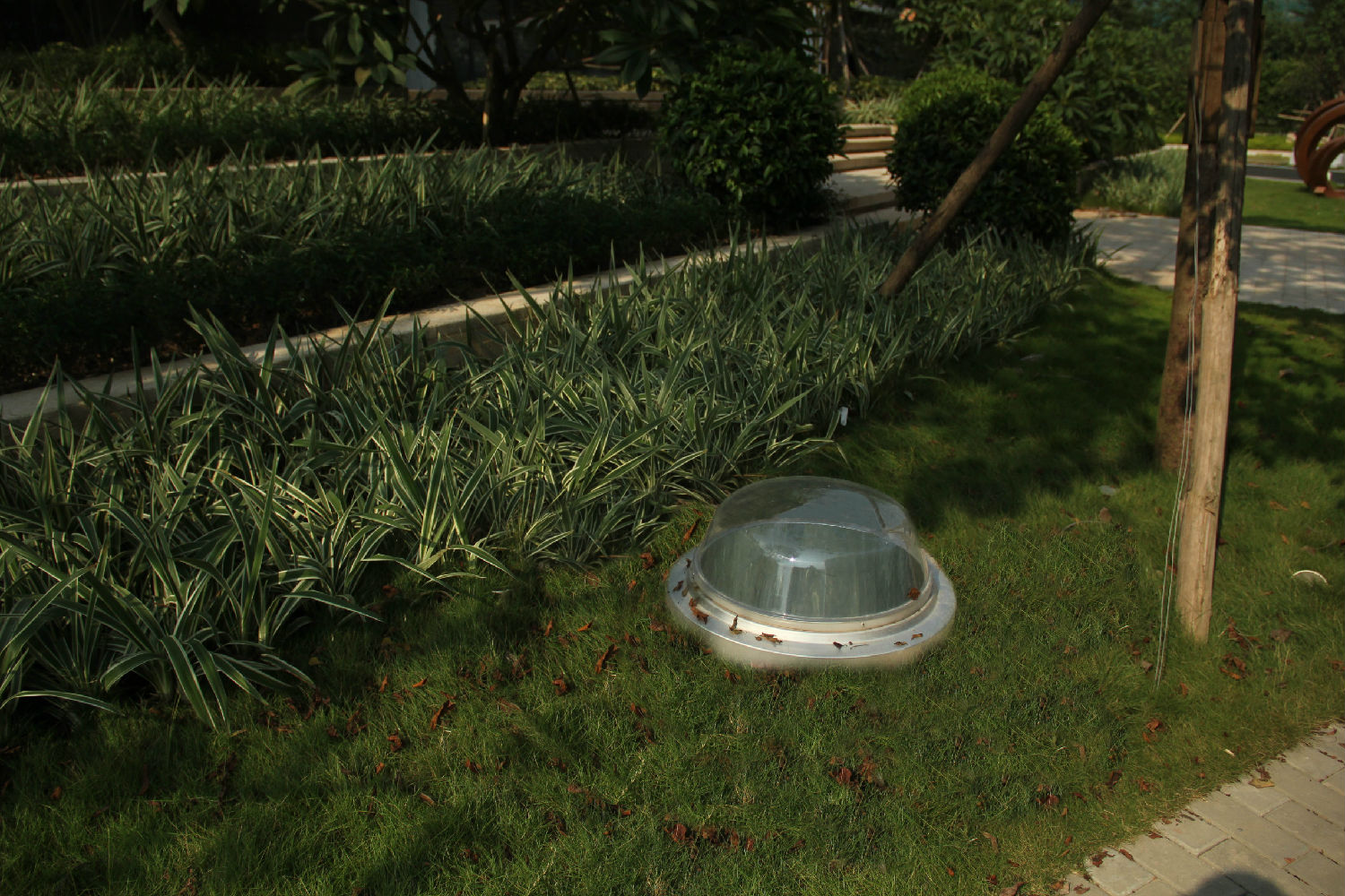 進(jìn)入金山谷創(chuàng)意園,在綠化帶、小路上可見一個(gè)個(gè)采光罩,小小的一個(gè)采光罩收集的自然光和太陽光足以照亮地下80-120平方米的室內(nèi)空間,并不會(huì)破壞建筑整體的美觀。